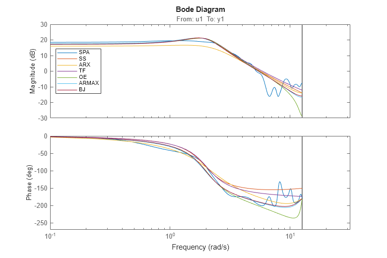 clf w = linspace(0.1,4*pi,100); bp = bodeplot(GS,m,mx,mtf,md2,am2,bj2,w); bp.PhaseMatchingEnabled = 'on'; legend({'SPA','SS','ARX','TF','OE','ARMAX','BJ'},'Location','West');