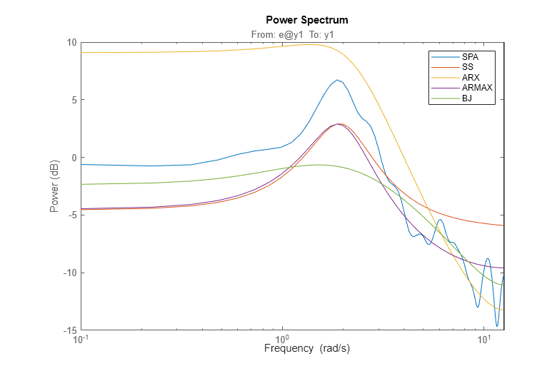 The noise spectra of the estimated models can also be analyzed. For example here we compare the noise spectra the ARMAX and the Box-Jenkins models with the state-space and the Spectral Analysis models. For this, we use the spectrum command: