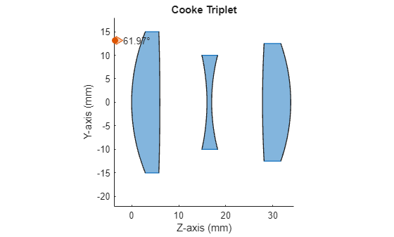 This example shows how to design a Cooke triplet lens system. This example requires the Optical Design and Simulation Library for Image Processing Toolbox™. You can install the Optical Design and Simulation Library for Image Processing Toolbox from Add-On Explorer. For more information about installing add-ons, see Get and Manage Add-Ons.