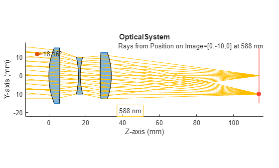 The rest of the example shows how to add optical components to this optical system, trace rays through the optical system, focus the rays through the optical system on an image plane, and create variants of the optical system.