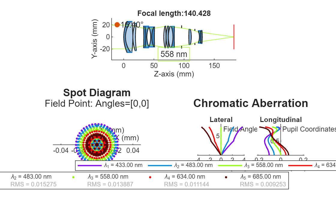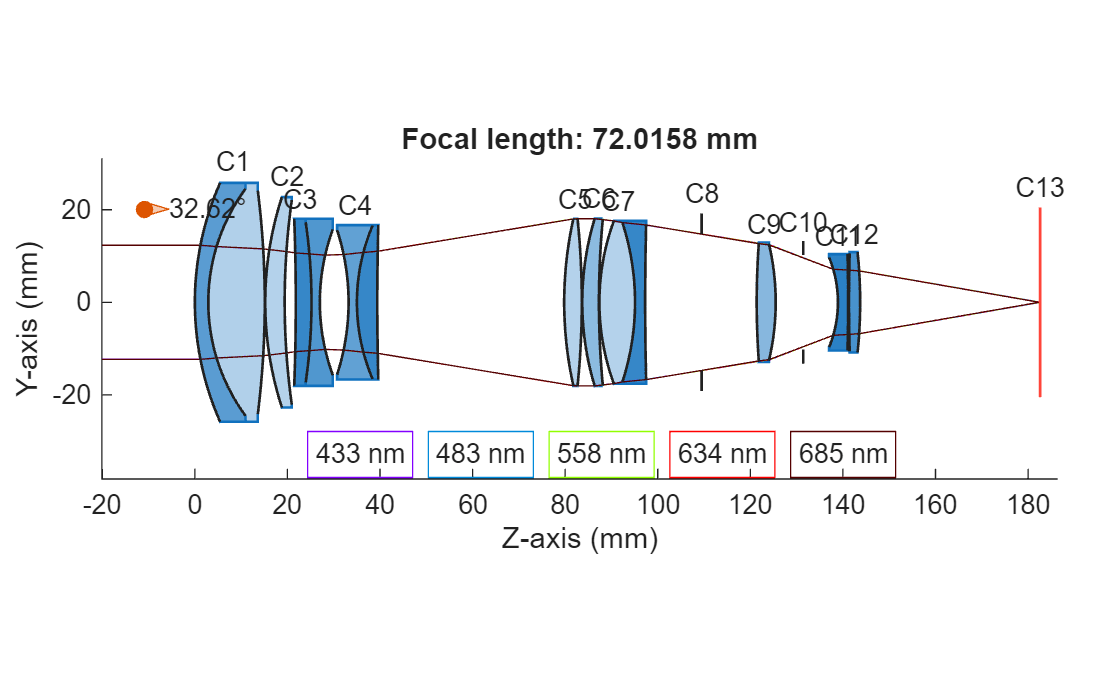 This example requires the Optical Design and Simulation Library for Image Processing Toolbox™ and the Optimization Toolbox™. You can install the Optical Design and Simulation Library for Image Processing Toolbox from Add-On Explorer. For more information about installing add-ons, see Get and Manage Add-Ons.