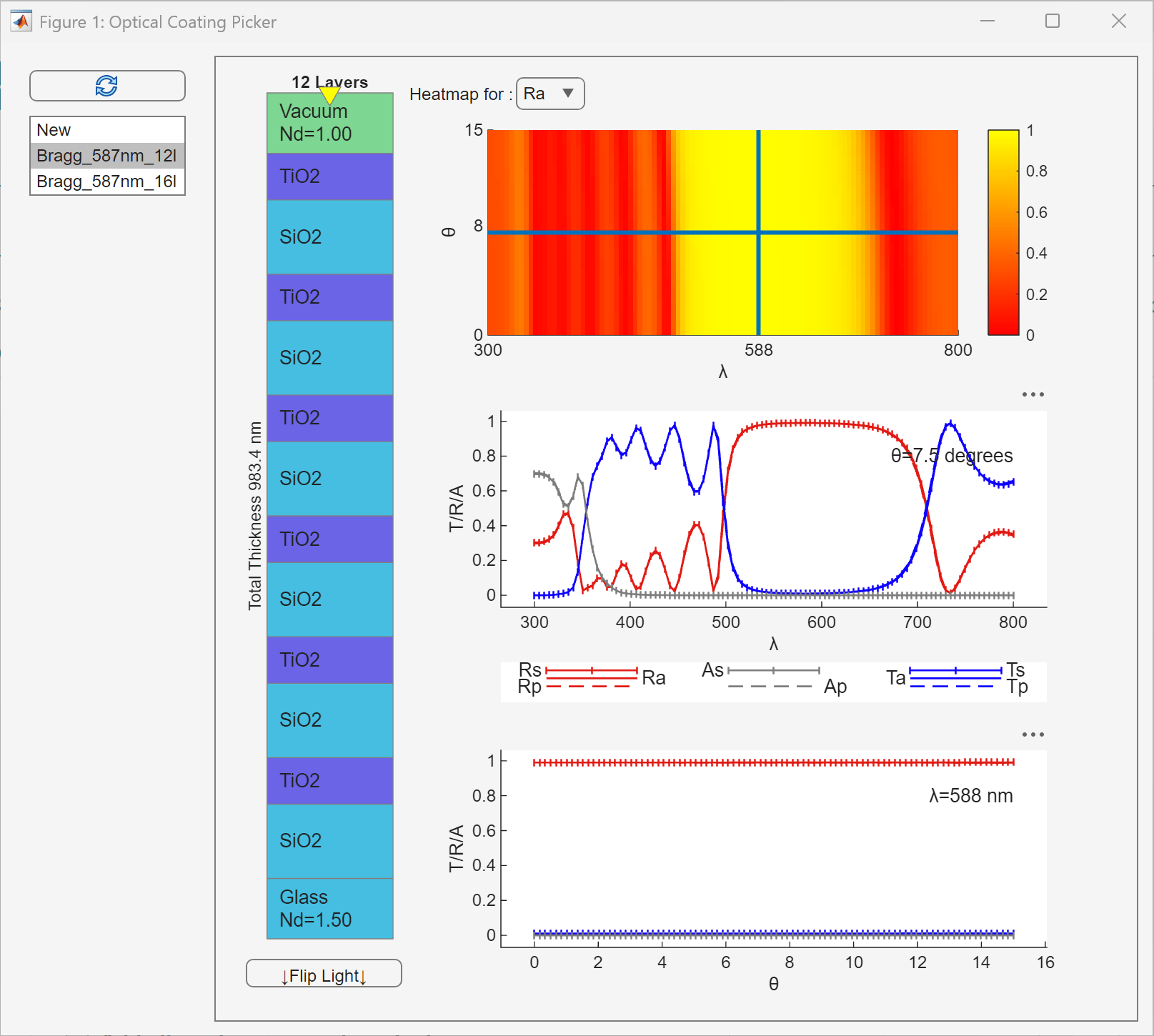 angle against wavelength. By default, the optical coating picker plots a