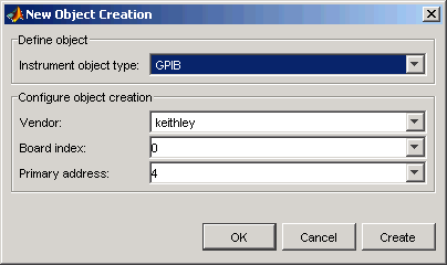 The Test & Measurement Tool creates interface objects automatically when you open a communication channel to an instrument by clicking the Communication Status button. To explicitly create and configure an interface object: