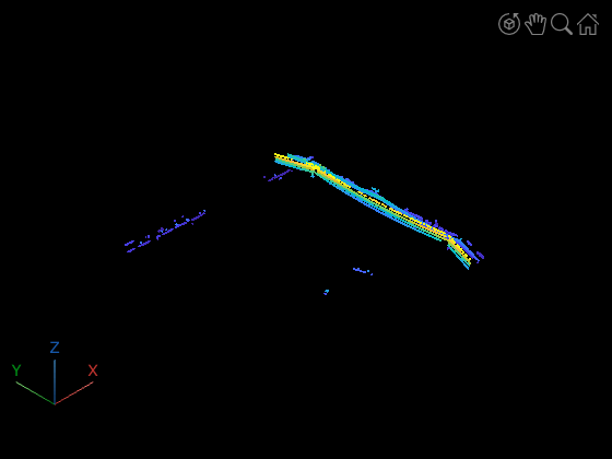 % Create a pretrained RandLA-Net segmenter = randlanet("dales"); % Downsample point cloud for faster processing. You can skip this % step to segment the full point cloud and obtain even more precise results. ptCloud = pcdownsample(fullPointCloud,"gridNearest",0.5); % Perform inference to predict labels. labels = segmentObjects(segmenter,ptCloud); % Extract power lines fullPowerlinesPtCloud = select(ptCloud,labels == "powerlines"); % Remove noise in segmented point cloud powerlinesPtCloud = pcdenoise(fullPowerlinesPtCloud,NumNeighbors=40); % Visualize pcviewer(powerlinesPtCloud);
