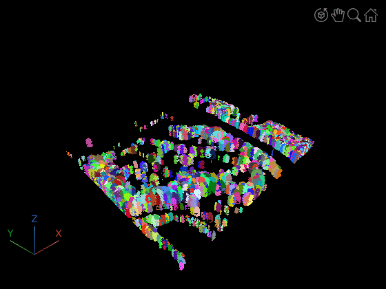 vegetationPtCloud = select(ptCloud,labels == "vegetation");The Extract Individual Tree Attributes and Forest Metrics from Aerial Lidar Data example shows how to segment individual trees from point cloud data by applying image processing techniques to a canopy height model (CHM). CHMs are raster representations of the heights of trees, buildings, and other structures above ground. Use marker-controlled watershed segmentation is to segment individual trees. You can convert the obtained 2-D labels to 3-D, since this data was collected from an aerial vehicle.