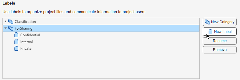 In the Project Settings dialog box, in the Labels section, select the category you want to create a label in. Then, click New Label.