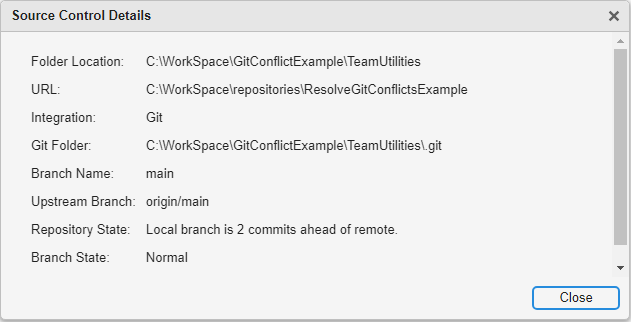 If conflicts occur, resolve them. For more information, see Resolve Git Conflicts. If you are resolving conflicts in models, see Resolve Conflicts in Models Using Three-Way Merge (Simulink) instead.