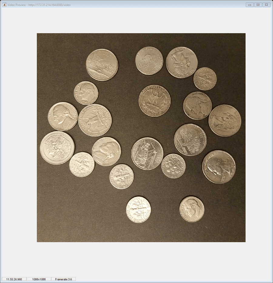 This example shows how to use the images captured by an IP camera to perform circle detection using the Image Processing Toolbox™. Detect coins in the field of view of the IP camera, and create an outline around each of them in real time.