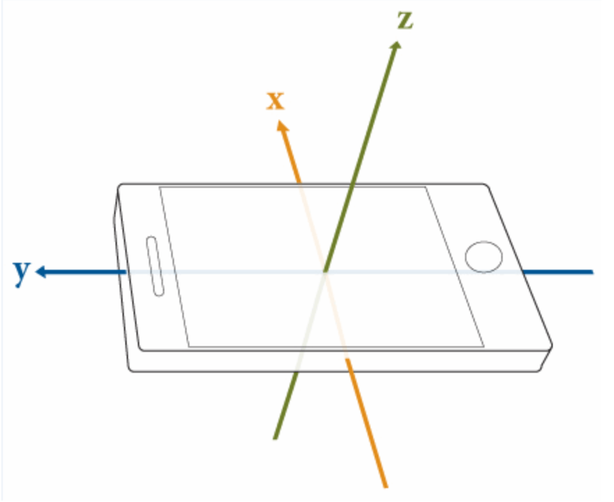 The accelerometer is a sensor that measures the rate of change of velocity, the acceleration. It uses a 3-dimensional cartesian coordinate system and returns acceleration values for each of the axes illustrated in the figure below.