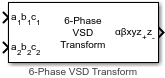 The 6-Phase VSD Transform block applies vector space decomposition (VSD) transform (or decoupling transform) on six-phase inputs (a1, b1, c1, a2, b2, and c2) to generate the corresponding six axis components (α, β, x, y, z+, and z-) in the following three subspaces.