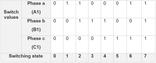 The controller operates the inverter in a complementary mode. The pulse that controls the lower transistor in an inverter leg is always opposite to the one controlling the upper transistor. Therefore, the upper-transistors of a three-phase inverter can have eight switching states (for space vector modulation PWM) described in the following table.