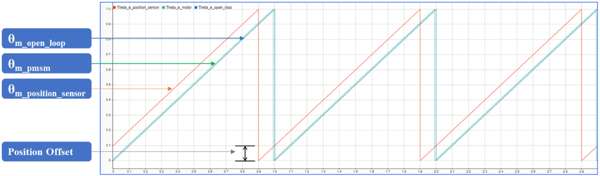 This figure shows the comparison of open-loop position from the control algorithm along with the actual position of the motor. The figure also shows the feedback from the position sensor. The position offset, which is the difference between the open-loop position and feedback position from the sensor, is computed by the algorithm provided in the offset calibration models.