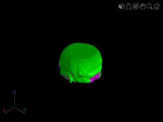 viewer2 = viewer3d(BackgroundColor="black",BackgroundGradient="off"); volshow(fixedVolume, ... Parent=viewer2, ... RenderingStyle="Isosurface", ... IsosurfaceValue=0.05, ... Colormap=[1 0 1], ... Alphamap=1); volshow(repositionedVolume, ... Parent=viewer2, ... RenderingStyle="Isosurface", ... IsosurfaceValue=0.05, ... Colormap=[0 1 0], ... Alphamap=1);