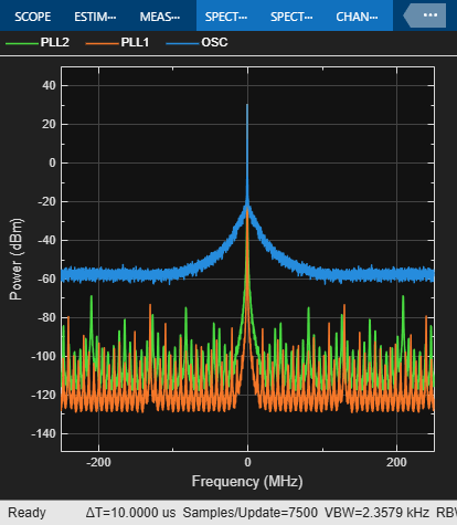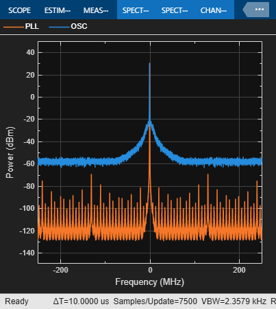 In the model above the 'Reference Oscillator' subsystem creates a signal with a given phase noise profile that is directly used as local oscillator (LO) in an RF upconverter mixer. The same reference signal is then used to drive a PLL with a relatively narrow loop bandwidth. For comparison, the output of the PLL is used to drive a second RF upconverter mixer (i.e. 'Upconverter stage PLL' in the image above). The filtering effects of the PLL on the reference oscillator phase noise are shown in the spectrum scope “Spectrum Local Oscillator”.