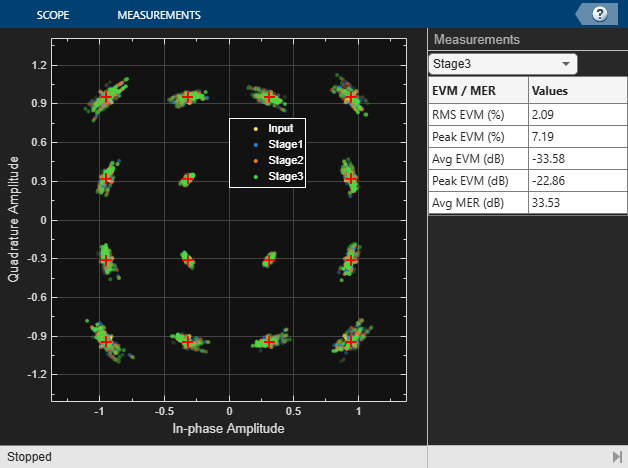 The RF input signal to both mixers is a modulated 16 QAM communications signal. A simple baseband receiver recovers the constellation of the input signal as well as the output of the two mixers. The constellation diagram allows to visualize and compare the three constellations and measure the Error Vector Magnitude (EVM).