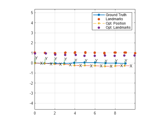 exampleHelperPlotPositionsAndLandmarks(initPoseStates, ... initLandmarkStates, ... optPoseStates, ... optLandmarkStates)