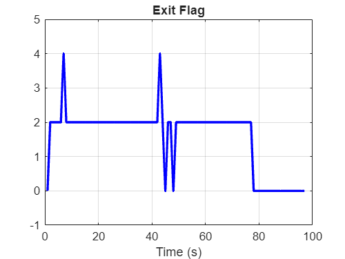 ExitFlagand theLastFeasibleIndexblocks display the values of theExitFlagandLastFeasibleIdxfields in the SolnInfo bus, respectively, as computed by the Timed Elastic Band block at each timestamp.
