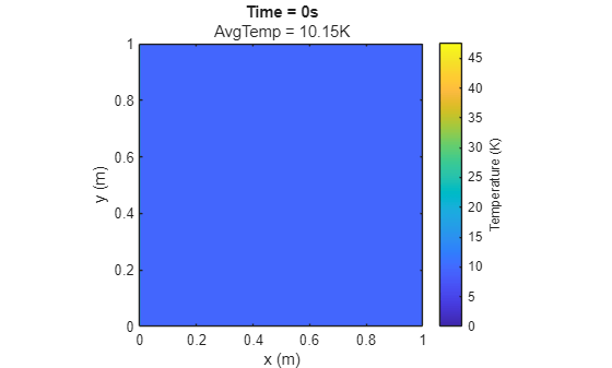 function plotTemperature(X,Y,u,t) contourf(X,Y,u,20,LineColor="none"); title("Time = "+num2str(t)+"s"); meanT = mean(u,"all"); subtitle(compose("AvgTemp = %.2fK",meanT)) xlabel("x (m)"); ylabel("y (m)"); axis equal tight; c = colorbar; c.Label.String = "Temperature (K)"; end