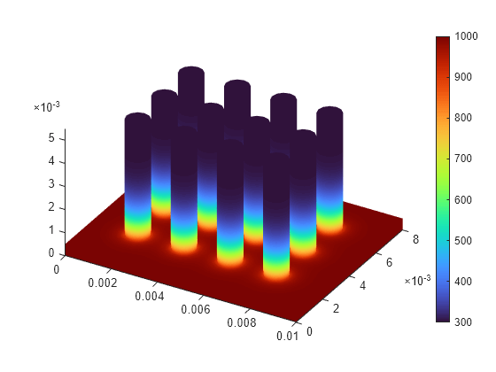 % Data to visualize meshData2 = results.Mesh; nodalData2 = results.Temperature(:,1); % Create PDE result visualization resultViz = pdeviz(meshData2,nodalData2, ... "ColorLimits",[300 1000]); % Animate figure for ii2 = 1:4 resultViz.NodalData = results.Temperature(:,ii2); pause(1.333) end