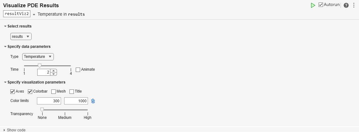 Click Show code to see and be able to copy the code used to create the plot. You can copy the generated code to recreate static and animated plots outside of the live script, and to modify and adapt the code to analyze different aspects of the problem or show results for a different problem. For example, copy the generated code that creates an animation and run it.