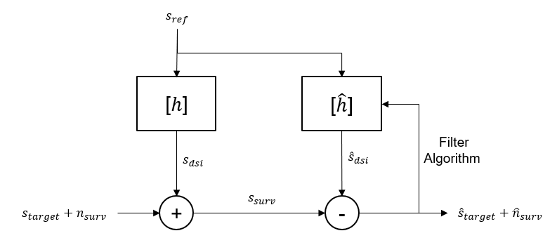 In parallel, the is passed through an estimate of the surveillance channel coefficients () to give an estimate of the DSI signal (). Finally, is subtracted from to give an estimate of our target signal () and noise ().