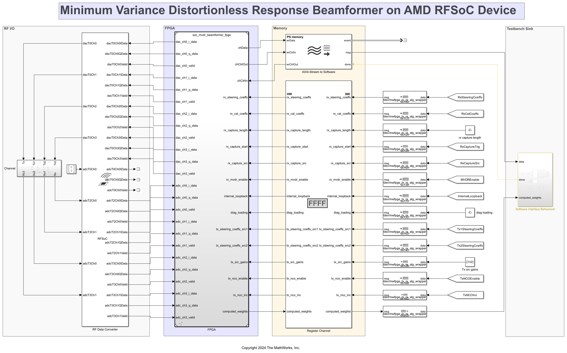 The top model integrates the FPGA model, soc_mvdr_beamformer_fpga.slx, to the RF data converter and AXI-Stream and AXI-Lite interfaces. The soc_mvdr_beamformer_fpga.slx model is to implement the test signal generation, signal reception, MVDR algorithm, signal capture, and interface logic.