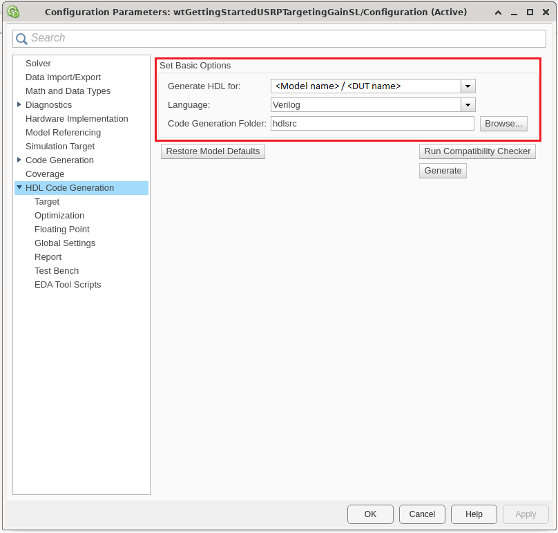 To open the Configuration Parameters window, in the HDL Code tab, click Settings. In the basic options of the HDL Code Generation panel, make sure that Language is set to VHDL or Verilog. By default, HDL Coder™ generates the VHDL® or Verilog® files in the hdlsrc folder. You can select an alternative location. If you make any changes, click Apply.