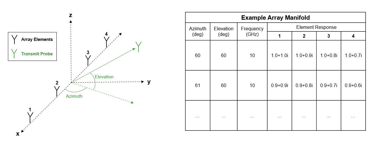 The array manifold is a dictionary of values that maps the complex response at each antenna element to incident angle, frequency, and polarization of a plane wave arriving at the array. Typically, the manifold is obtained in an anechoic chamber by moving a calibrated transmit probe operating at a known frequency to discrete azimuth and elevation points and measuring the complex response at each antenna element. The following figure shows a measurement scheme and an example resultant array manifold as a table of measured values:
