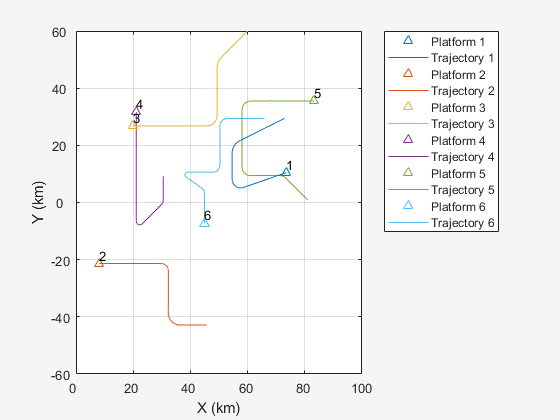 The six aircraft trajectories modeled in this example are described in [1]. The aircraft fly in an arrangement intended to be received by a radar located at the origin.