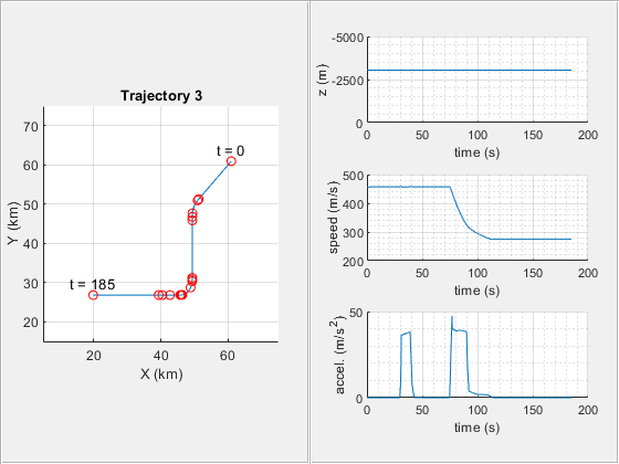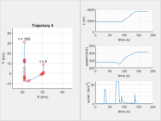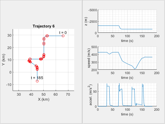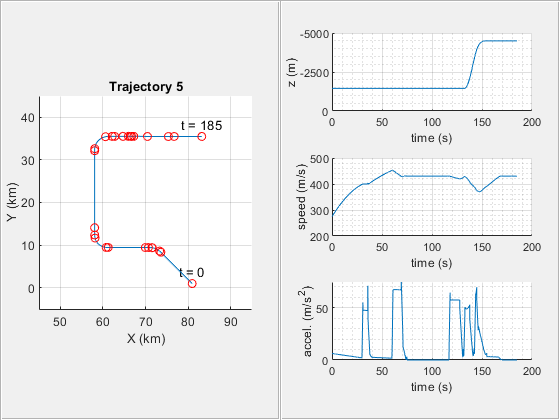 The fifth trajectory is representative of a maneuverable high-speed aircraft. It consists of three constant turns; however, it accelerates considerably throughout the duration of the flight. After the third turn the aircraft ascends to a level flight.