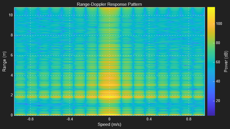 clear dca % Create connection to TI Radar board and DCA1000EVM Capture card dca = dca1000("IWR6843ISK"); % Initialize variables % Define a variable to set the sampling rate in Hz for the % phased.RangeDopplerScope object. Because the dca1000 object provides the % sampling rate in kHz, convert this rate to Hz. fs = dca.ADCSampleRate*1e3; % Define a variable to set the center frequency in Hz for the % phased.RangeDopplerScope object. Because the dca1000 object provides the % center frequency in GHz, convert this rate to Hz. fc = dca.CenterFrequency*1e9; % Define a variable to set the pulse repetition period in seconds for the % phased.RangeDopplerScope object. Because the dca1000 object provides the % chirp cycle time in us, convert this rate to seconds. The value is % multiplied by 2 in this example because we are plotting the data only for first % transmit channel out of 2 channels tpulse = 2*dca.ChirpCycleTime*1e-6; % Pulse repetition interval prf = 1/tpulse; % Define a variable to set the FMCW sweep slope in Hz/s for the % phased.RangeResponse object. Because the dca1000 object provides the % sweep slope in GHz/us, convert this sweep slope to Hz/s. sweepslope = dca.SweepSlope*1e6/1e-6; % Samples per chirp or RangeFFTLength nr = dca.SamplesPerChirp; % Number of active receivers nrx = dca.NumReceivers; % Number of chirps nchirp = dca.NumChirps; % Create range doppler scope to compute and display the response map. rdscope = phased.RangeDopplerScope(IQDataInput=true,... SweepSlope = sweepslope,SampleRate = fs,... DopplerOutput="Speed",OperatingFrequency=fc,... PRFSource="Property",PRF=prf,... RangeMethod="FFT",RangeFFTLength=nr, ... ReferenceRangeCentered = false); % The first call of the dca1000 class object may take longer due to the % configuration of the radar and the DCA1000EVM. To exclude the configuration % time from the loop's duration, make the first call to the dca1000 object % before entering the loop. iqData = dca(); % Specify the duration in seconds for which the loop should run stopTime = 150; ts = tic(); % Execute the loop until the stopTime specified is reached while (toc(ts)<stopTime) % Capture the ADC data (IQ data) from TI Radar board and DCA1000EVM iqData = dca(); % Get the data from first receiver antenna and first transmitter antenna % (Every alternate pulse is from one transmitter antenna for this % configuration) iqData = squeeze(iqData(:,1,1:2:end)); % Plot the range doppler response corresponding to the the input signal, % iqData. rdscope(iqData); end