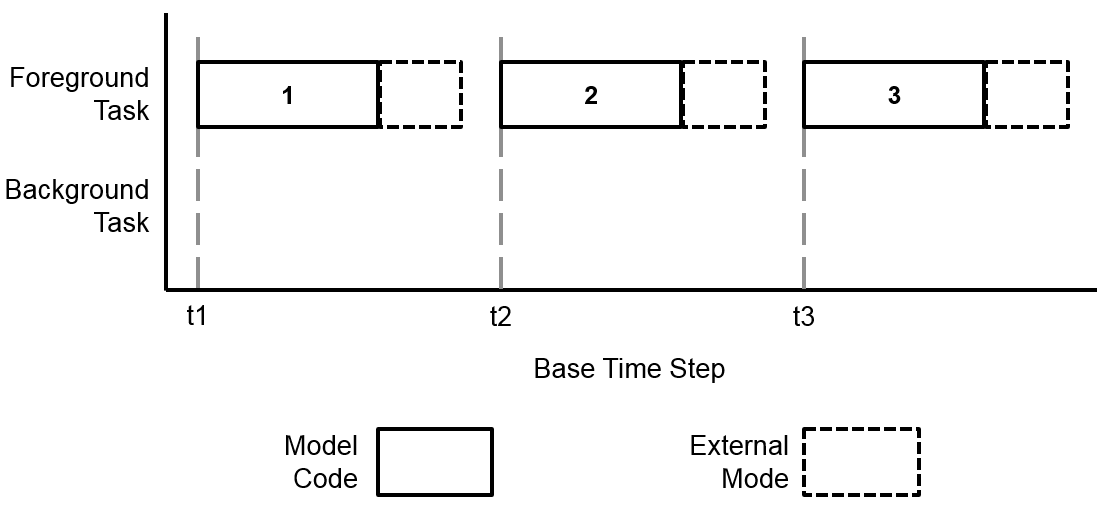 The task descriptions that follow assume Single-Tasking Execution (Simulink Coder). They can also be applied to Multitasking Execution (Simulink Coder), where the background task containing the external mode executes with the lowest priority.