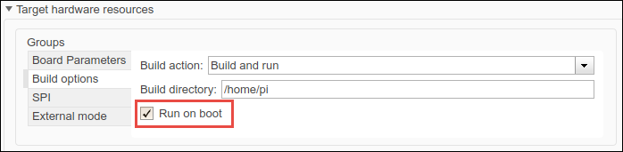 5. From the Groups list under Target hardware resources, select Build options > Run on boot.