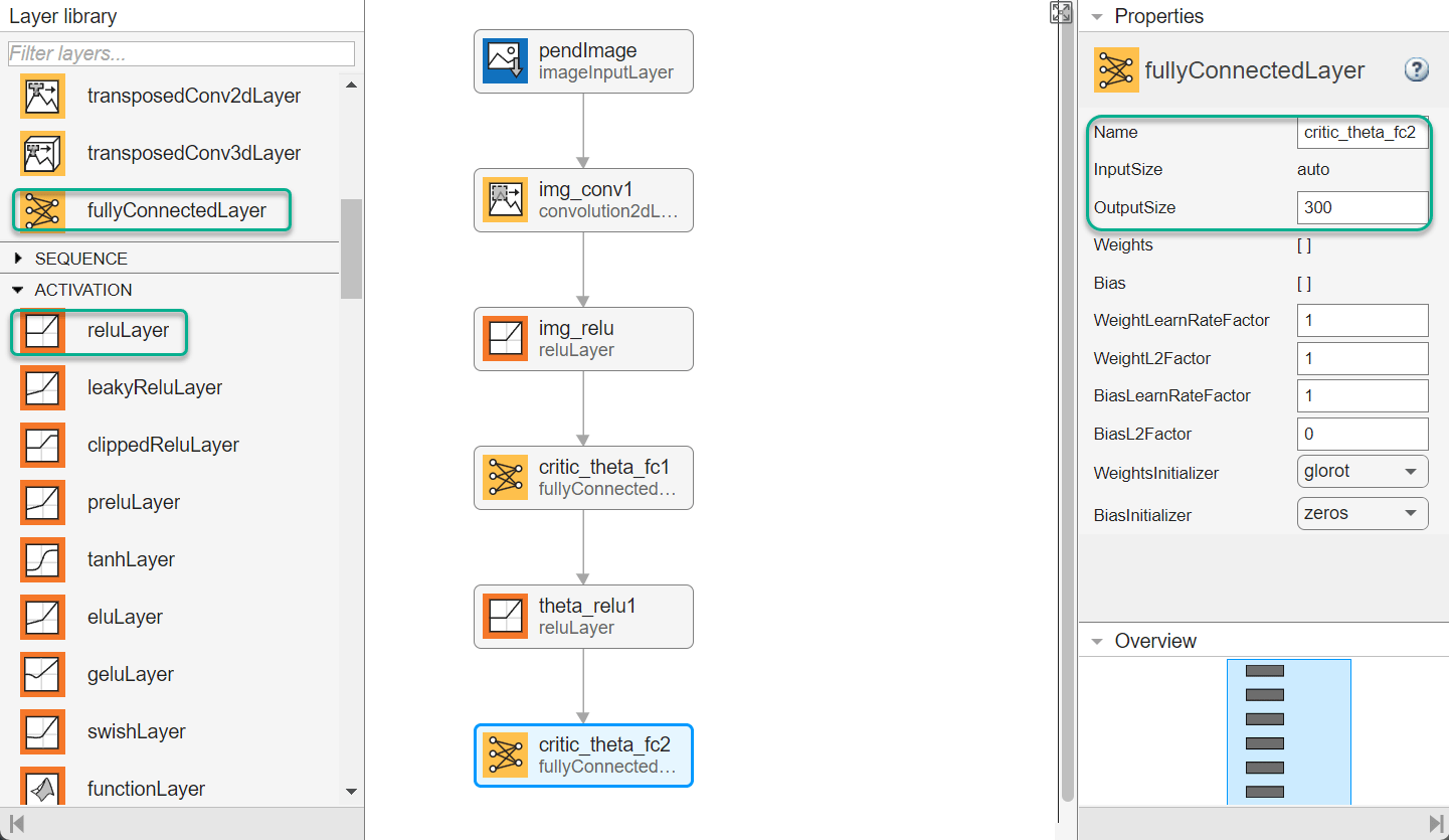 additionLayer— Connect the output of all input paths to the input of this layer.reLULayerfullyConnectedLayer— Set OutputSize to1for the scalar value function.