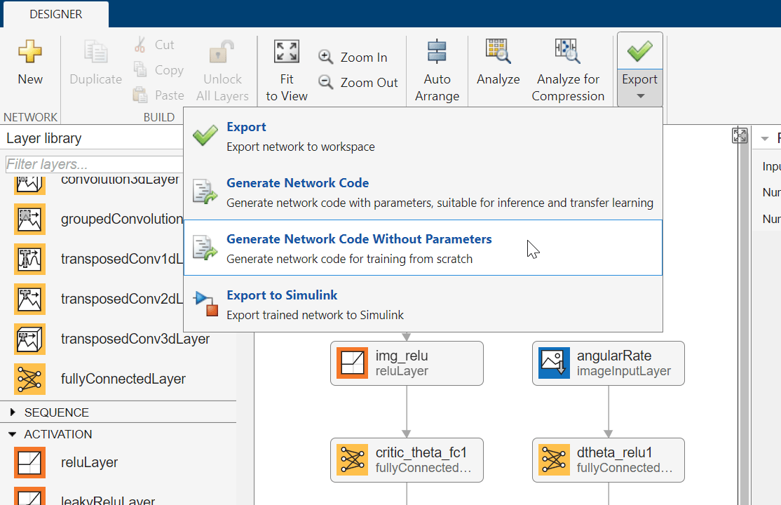 Alternatively, to generate equivalent MATLAB code for the network, click Export > Generate Network Code Without Parameters.