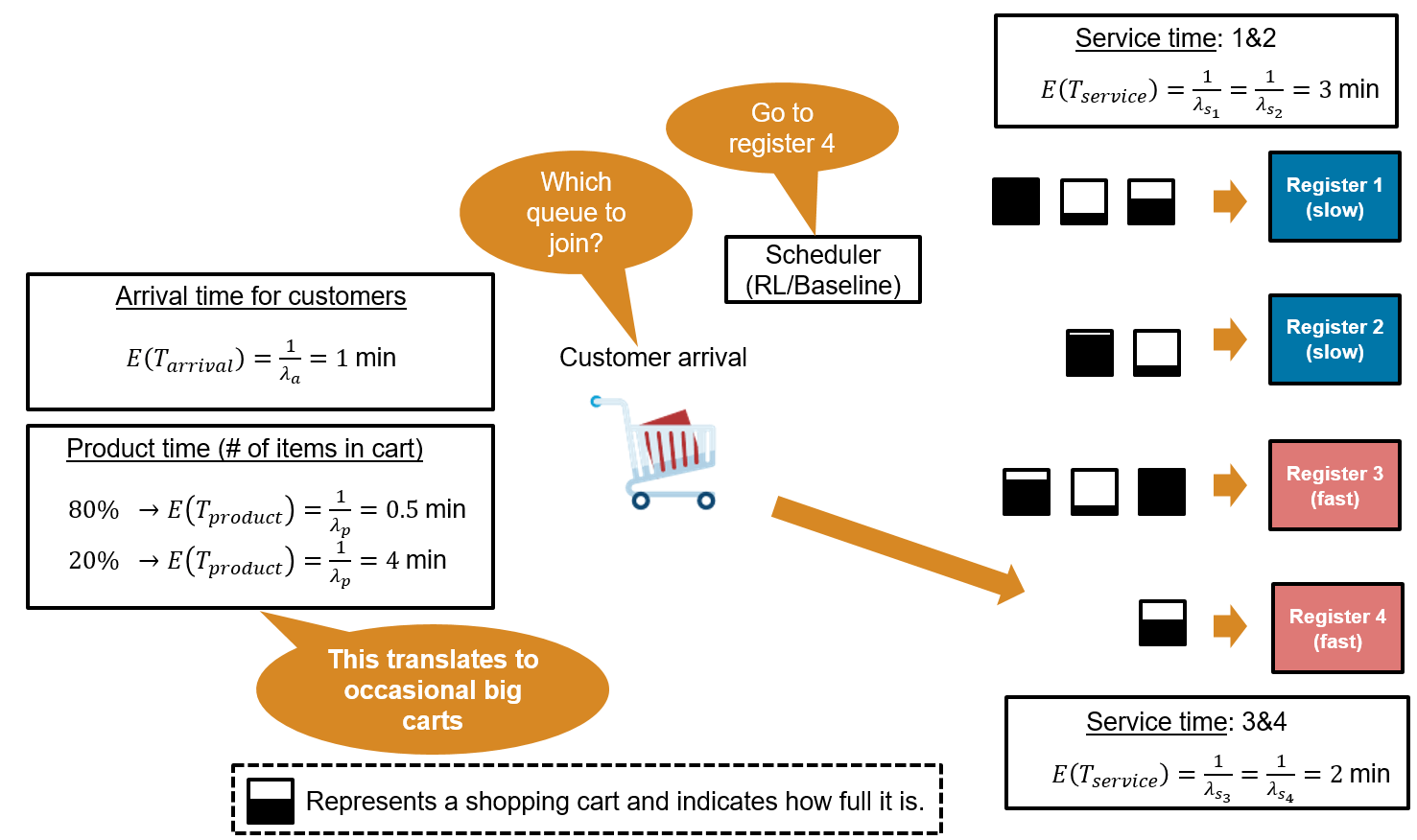 The total time a customer spends at a register is equal to the service time (which is register specific) plus the product time (which is cart specific). This means that a slow register with a big cart will take much longer than a fast register with a small cart.