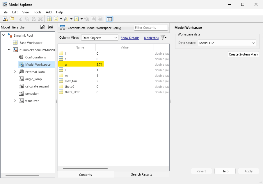env = rlSimulinkEnv(mdl,mdl+"/RL Agent",obsInfo,actInfo);To define the initial condition of the pendulum as hanging downward, specify an environment reset function using an anonymous function handle. This reset function uses setVariable (Simulink) function to set the model workspace variable theta0 to pi. For more information, see Reset Function for Simulink Environments.