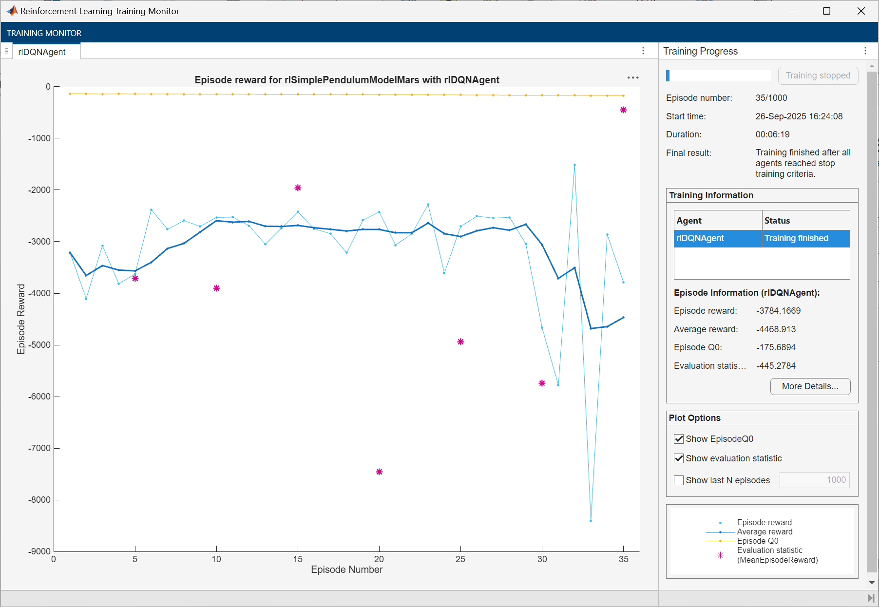 trainingOptions = rlTrainingOptions( ... MaxEpisodes=1000, ... MaxStepsPerEpisode=500, ... ScoreAveragingWindowLength=5, ... Verbose=false, ... Plots="training-progress", ... StopTrainingCriteria="EvaluationStatistic", ... StopTrainingValue=-1100);