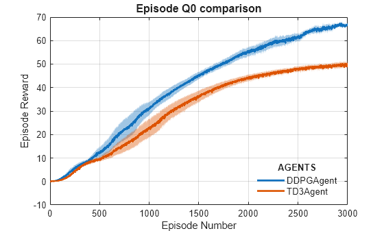 For the DDPG and TD3 agents, plot the average and standard deviation of the episode reward (top plot) and the episode Q0 value (bottom plot). The episode Q0 value is the critic estimate of the discounted long-term reward at the start of each episode given the initial observation of the environment. For a well-designed critic, the episode Q0 value approaches the true discounted long-term reward.