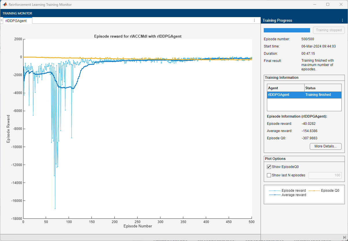This example shows how to train a deep deterministic policy gradient (DDPG) agent for adaptive cruise control (ACC) in Simulink®. For more information on DDPG agents, see Deep Deterministic Policy Gradient (DDPG) Agent.