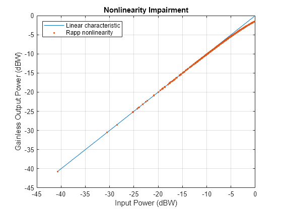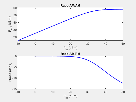 Introduce nonlinear distortion using the Rapp model in the power amplifier. Set the parameters for the Rapp model to match the characteristics of the memoryless model from TR 38.803 Annex A.1. These figures show the nonlinearity introduced by the Rapp model.