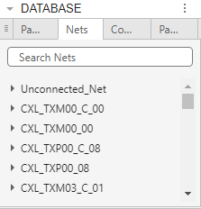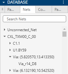In the DATABASE pane click on one of the tabs to select a PCB element. For this example click Nets. The list of the board's nets appears.
