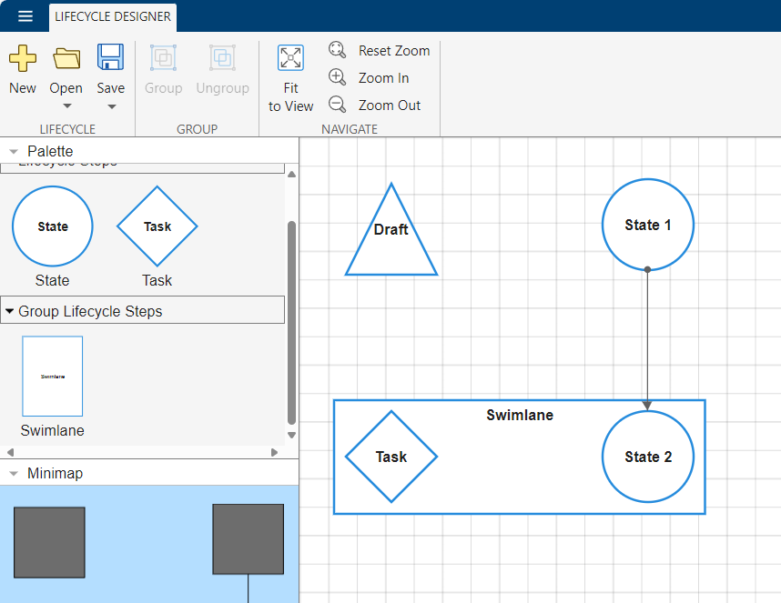 Each Modelscape model must be associated with a lifecycle. A lifecycle is a set of possible states the model can inhabit, as well as the transitions between them. Each model version must be in one of the states of the lifecycle.