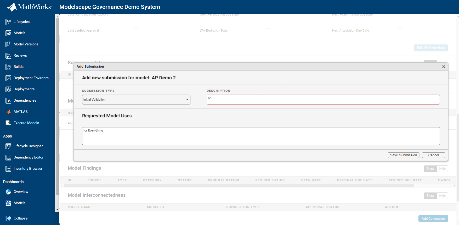 Add a submission to bring the model to the attention of the model validation team. The system will generate an automated email to notify the team.