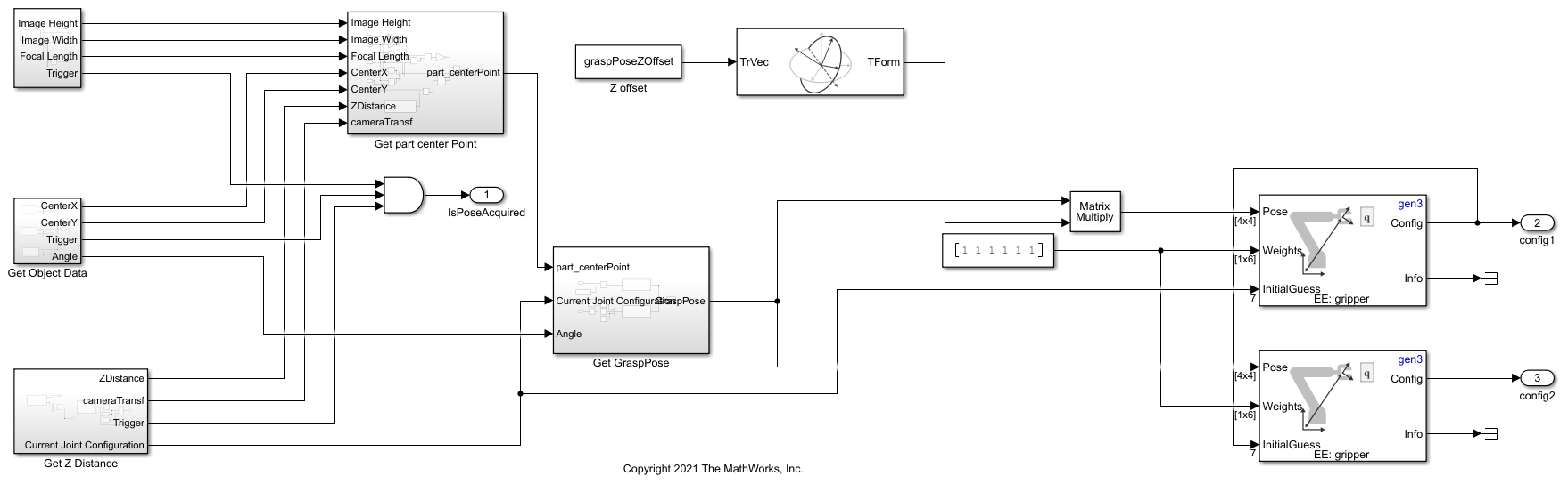 The model consists of a state machine, which performs object localization and motion planning for a robotic manipulator.