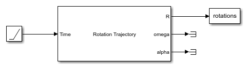 This example shows how to generate a trajectory that interpolates between rotations using the Rotation Trajectory block.
