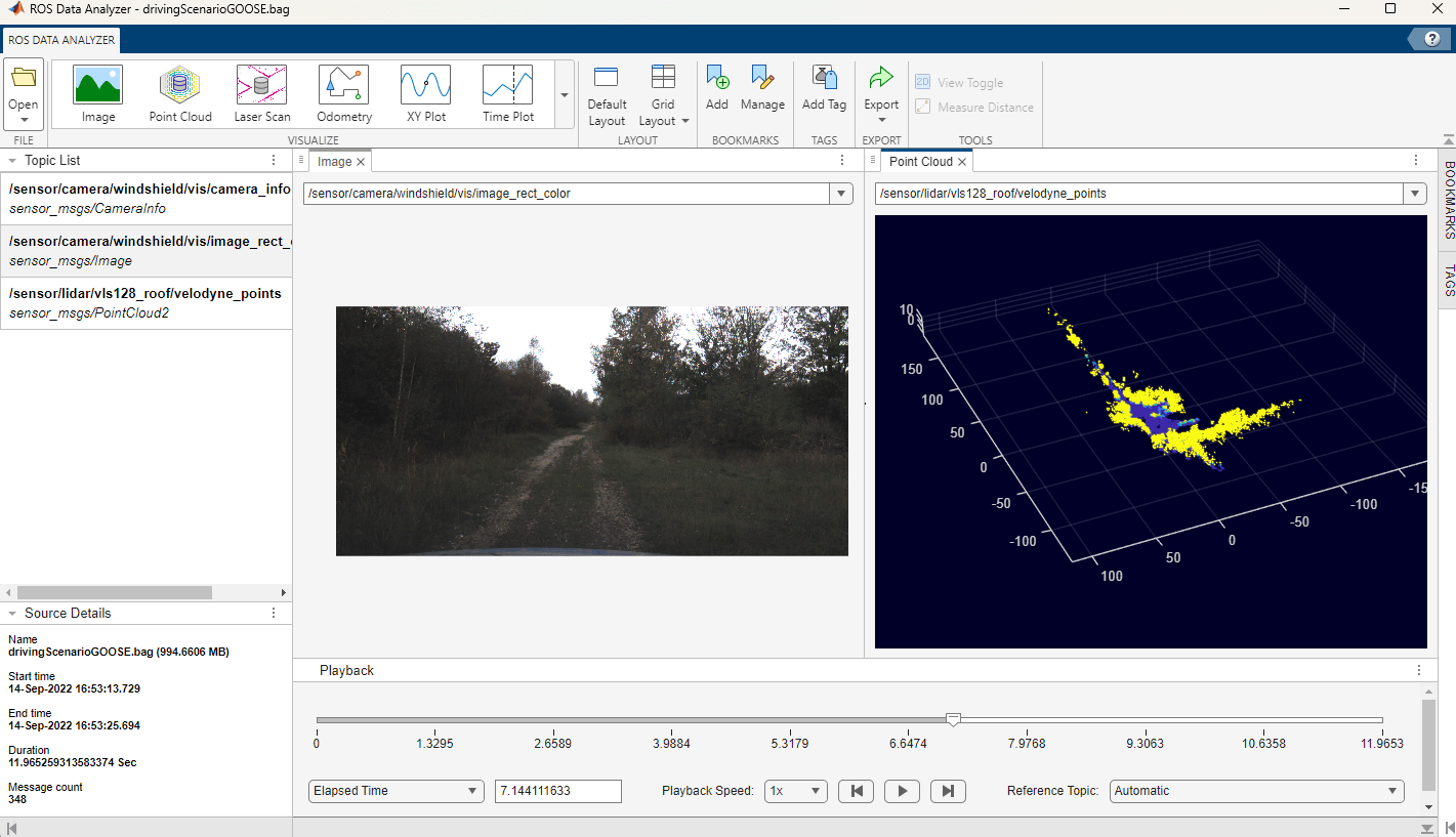You can visualize the contents of the rosbag file using the ROS Data Analyzer (ROS Toolbox) app. You can observe and correlate features such as trees and bushes between the camera images and the lidar point clouds.
