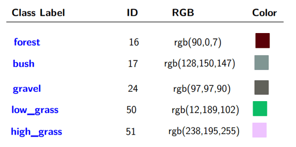 The semanticID output predicts one of 64 object types. The GOOSE labeling policy assigns each semantic class a unique ID and a specific RGB color value. This image illustrates these assignments for the objects identified in the off-road driving scenario used in this example.