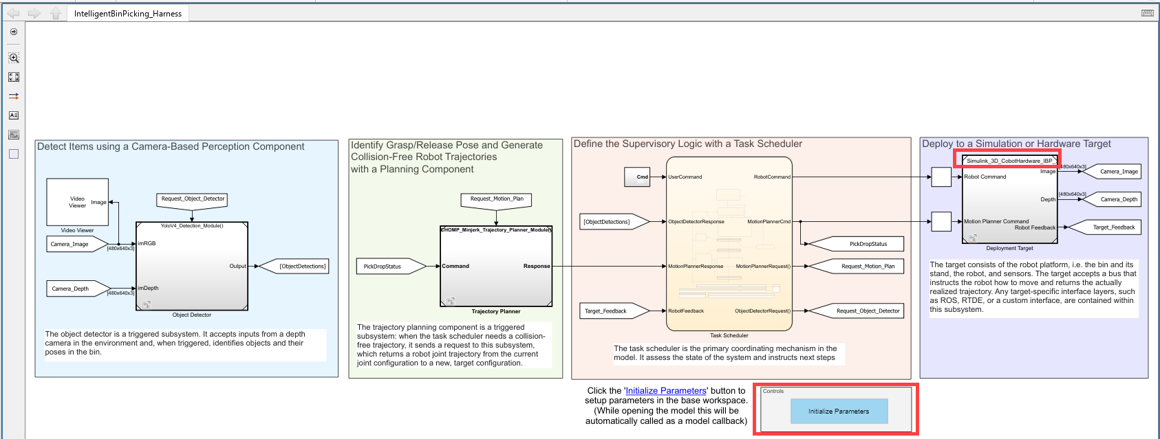 open_system("IntelligentBinPicking_Harness.slx")In the model, click Initialize Parameters to set up all required parameters for URSim. The updated model also displays the new target environment.