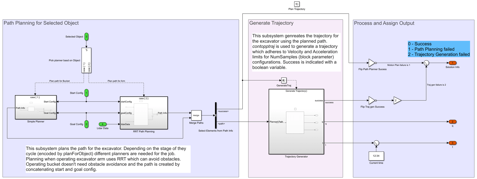 This example employs a similar approach in Simulink within the Trajectory Planner, a Function-Call subsystem triggered at the beginning of each stage in the excavation cycle. The two most significant steps from the MATLAB example, Path Planning and Path to Trajectory Conversion, are implemented in Simulink in this example using MATLAB System blocks. In addition to path planning using RRT and trajectory generation, this example also includes a simple planner, detailed in Path planning for Selected Object. This example also moves the arm from the drop location to the excavation location to close the loop, whereas the MATLAB example shows only the movement from the excavation to the drop location.